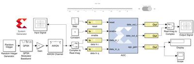 В данной статье рассматривается возможность применения Vivado System Generator для моделирования HDL-блоков на примере системы автоматической регулировки усиления. Представлен принцип работы автоматической регулировки усиления и её реализация на Verilog. Описано поэтапное построение Simulink модели. В качестве входного воздействия рассматривается смесь QPSK сигнала и белого шума.
