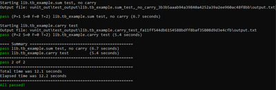 Теперь мы видим, что VUnit запускает оба тестовых случая: «суммарный тест, без переноса» и «тест с переносом». Оба тестовых примера проходят через наши самопроверяющиеся утверждения BFM без сбоев. Теперь мы можем сообщить, что наш проект поддерживает все необходимые функции.