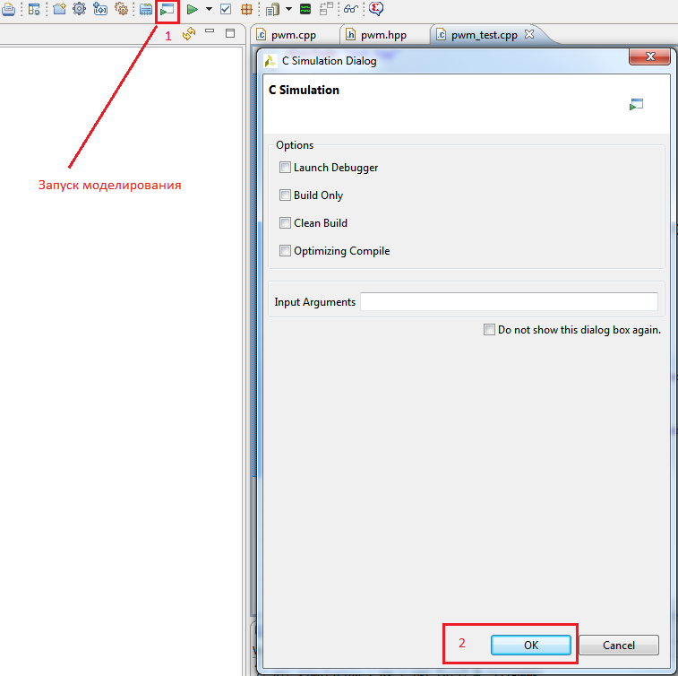 Просто нажимаем кнопку «Run C Simulation» на панели инструментов вверху (Рисунок 15). Если у Вас свой проект, то понадобится указать свой файл с тестом в настройках проекта во вкладке «Моделирование»: