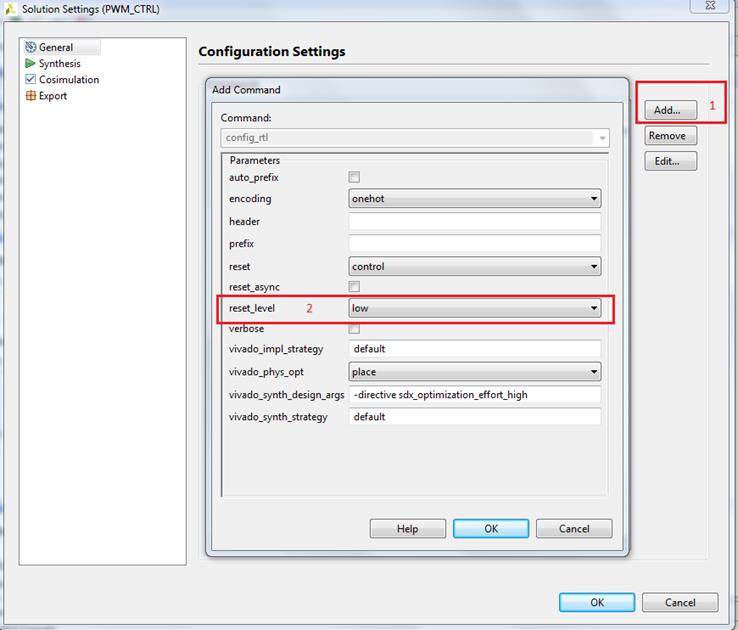 Сделаем активным решение PWM, дважды щёлкнув по нему в Проводнике. Выберем функцию PWM для синтеза (как мы это делали, можно посмотреть тут: Рисунок 20). Если у вас свой проект или вы создавали проект первым способ, то нужно в настройках решения указать, что нам нужен сброс с низким активным уровнем (Рисунок 25). Запускаем синтез, а затем и ко-симуляцию с опцией «Dump Trace all».