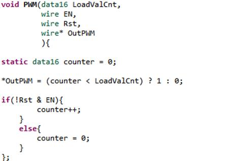 Теперь рассмотрим функцию PWM (Рисунок 13). Эта функция должна увеличивать значение переменной counter каждый раз, когда мы вызываем эту функцию, при условии, что сброс не выставлен (т. е. Rst == 0) и активно разрешение счёта (EN == 1). Поэтому мы используем ключевое слово static (это значит, что переменная counter создается и инициализируется только один раз, и каждый следующий вызов этой функции будет использовать её предыдущее значение). Когда значение в счетчике перестанет быть меньше значения, с которым мы его сравниваем, выход изменит значение с логической «1» на логический «0».