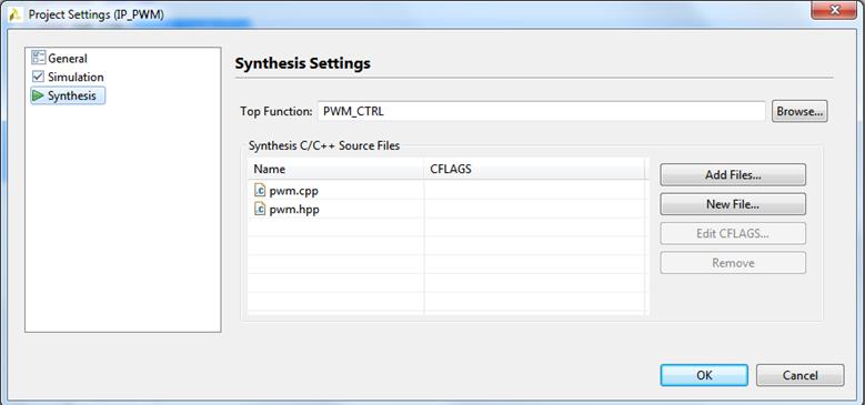 Теперь подготовим к синтезу функцию PWM_CTRL. Для начала нужно указать в настройках проекта функцию, которая будет синтезирована (Рисунок 20). Тут, по аналогии с проектом на HDL, синтезируется все, что включается в модуль (в HLS – функцию), указанную «топовой» (верхнего уровня).