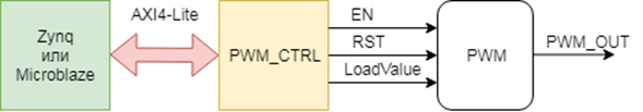 Наш ШИМ будет состоять из двух функций. Первая будет реализовывать интерфейс AXI4-Lite, через который мы будем задавать значения регистров. Вторая функция будет реализовывать счетчик (ШИМ представляет собой счетчик, который, досчитав до заданного ему значения, меняет состояние выхода регистра на противоположное). Почему это реализовано в виде двух разных функций, станет понятно, когда мы дойдем до написания теста к нашему модулю.