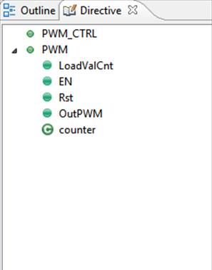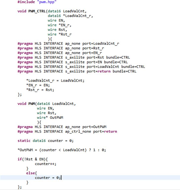 Начнем с функции PWM_CTRL (Рисунок 12). Эта функция должна просто хранить и выдавать значения, которые будут управлять счетчиком. Она не должна ничего возвращать, поэтому её тип возврата – void. Т. к. счетчик будет шестнадцатиразрядный, то загружаемое значение должно быть той же разрядности. Сигналы включения и программного сброса – однобитные.