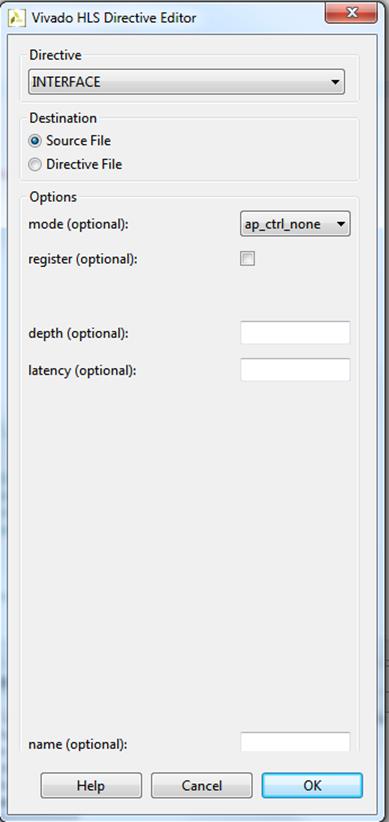 Дважды щёлкнем по «PWM», откроется редактор директив, выберем в нём директиву и опции, как показано на рисунке ниже (Рисунок 18). Выбранная опция указывает компилятору, что на уровне функции нам не нужны сигналы управления (т. к. управлять мы будем сами). Директивы могут находиться непосредственно в описании функции, а могут находиться в файле с директивами, в нашем случае будем использовать первый вариант. Теперь сделаем тоже самое для OutPWM (Рисунок 19). Если нажать кнопку «Help», то можно подробно ознакомиться с каждой опцией, которая относится к этой директиве. Также там можно прочитать, какие опции используются по умолчанию. На этом подготовка функции PWM к синтезу окончена.