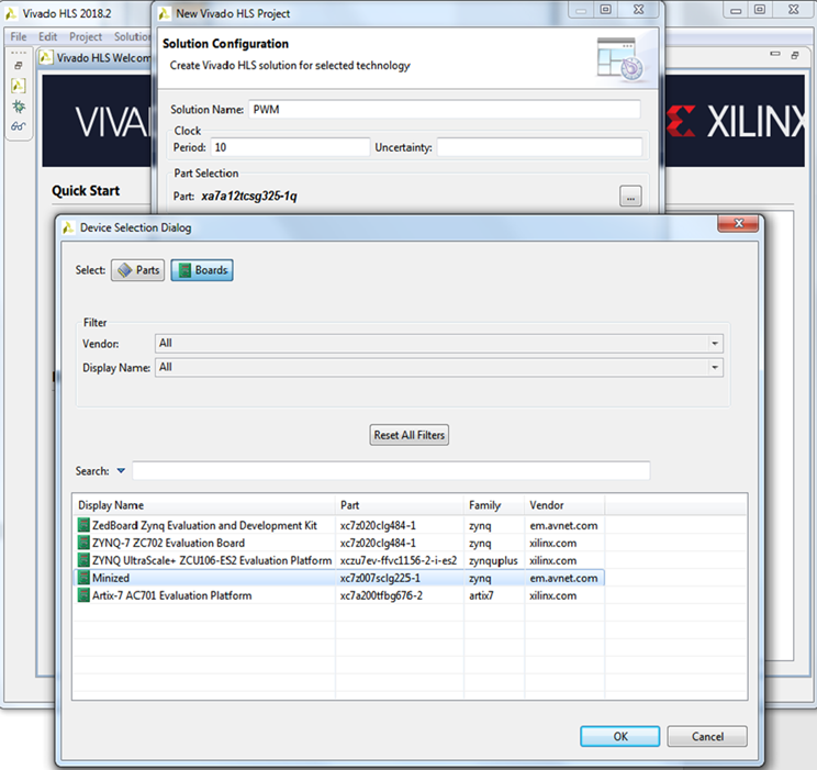 Выбираем свою ПЛИС. Если у вас есть какая-нибудь отладочная плата, то можно прописать в файл VivadoHls_boards.xml строку по аналогии с теми, что уже там написаны. Для MiniZed она выглядит так: