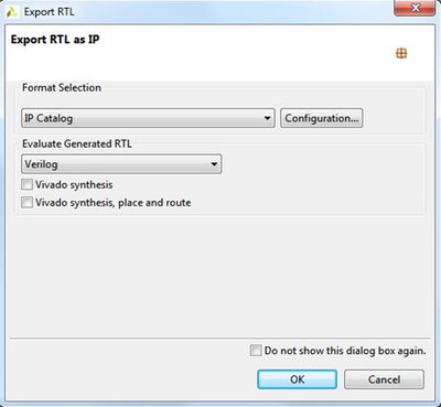Осталось экспортировать IP. Для этого нажимаем на панели инструментов «Export RTL». В появившемся окне можно указать настройки экспорта и выполнить синтез средствами Vivado, что даст более точную оценку параметров IP, но и займет больше времени (Рисунок 32).