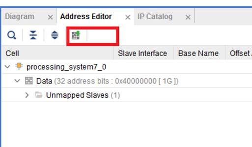 Добавляем наши IP-блоки на схему в блок дизайне. Еще нам понадобятся стандартные блоки, которые называются “Processor System Reset” и “AXI Interconnect” (нужен для подключения M AXI GP к AXI4-Lite). Интерконнект по умолчанию с двумя мастерами, нам же нужен только один, поэтому открываем его двойным кликом и выбираем нужное количество мастеров. Соединяем все блоки между собой как показано на рисунке (Рисунок 6). Выход OutPWM_V сделаем внешним для блок дизайна (просто щелкаем по сигналу и выбираем “Make External”). Во вкладке “Window” жмем “Address Editor” в открывшейся вкладке нажимаем на кнопку автоматического назначения адресов (Рисунок 7).