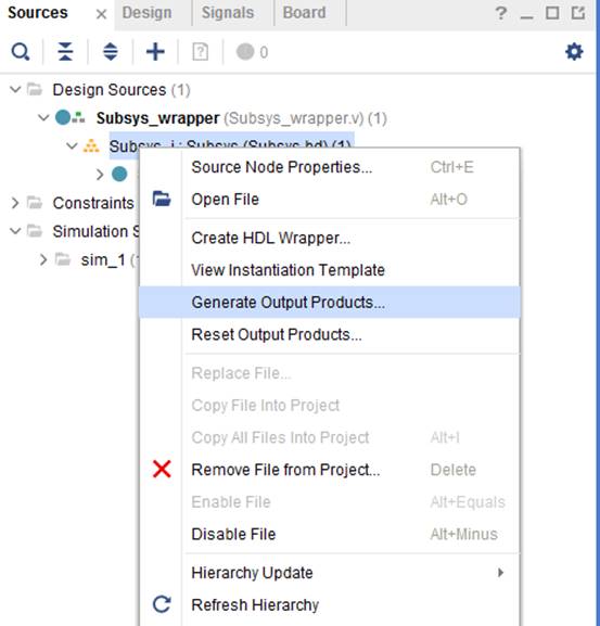 Далее нажимаем во вкладке “Source” проекта по блок дизайну правой кнопкой мыши и выбираем “Generate Output Products”. В открывшемся окне выбираем “Global”. После этого снова жмем по блок дизайну правой кнопкой мыши и жмем “Create HDL Wrapper” (Рисунок 9). В открывшемся окне оставляем все как есть.