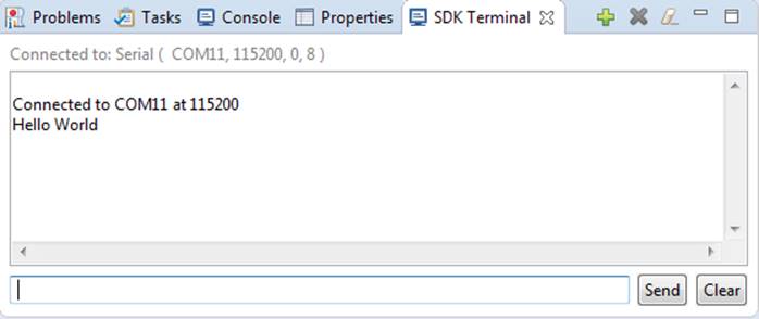 Переключаемся на вкладку “SDK Terminals”. Мы должны увидеть сообщение “Hello World” (Рисунок 7).