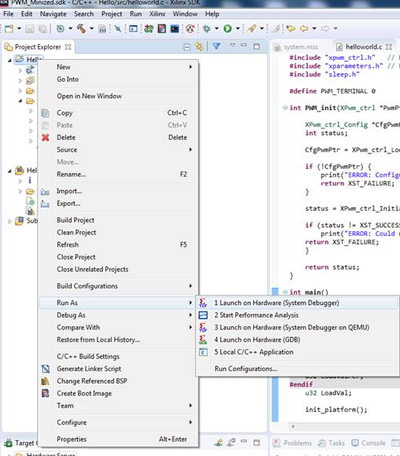 Прошиваем нашу СнК, т.к. мы уже настроили параметры запуска при запуске “Hello World”, то можно просто щелкнуть право кнопкой мыши по проекту→Run As→Launch On Hardware (System Debugger) (Рисунок 8). Если вы отключали плату от компьютера, то необходимо заново подключиться в терминале. После прошивки мы должны увидеть, как яркость светодиода изменяется от 0 до 100%. Чтобы менять яркость вручную, нужно пересобрать проект, изменив значение с 0 на 1 для PWM_TERMINAL.