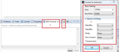 Подключаем отладочную плату к компьютеру. Нажимаем Ctrl + B (Build Project). Идем во вкладку “SDK Terminal” и нажимаем на кнопку добавления порта. В открывшемся окне нужно указать COM порт, к которому подключен USB UART преобразователь и скорость обмена данными (Рисунок 5). Узнать номер порта можно в диспетчере устройств во вкладке COM и LPT.