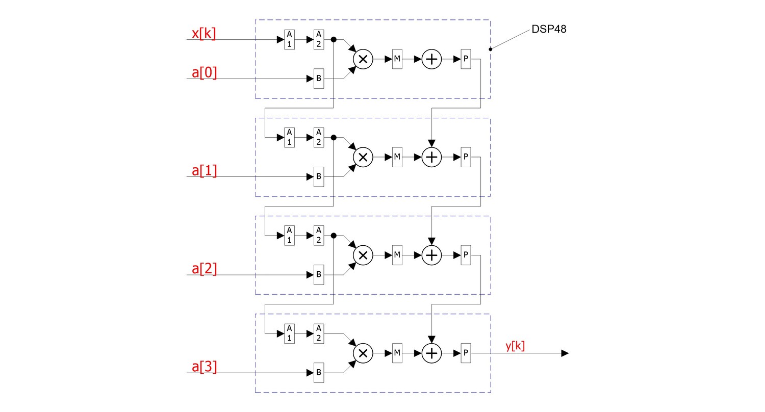 В результате мы получили схему, в которой все элементы КИХ фильтра укладываются внутри аппаратных блоков DSP48, что позволяет достичь для выбранного кристалла максимально возможной рабочей тактовой частоты.
