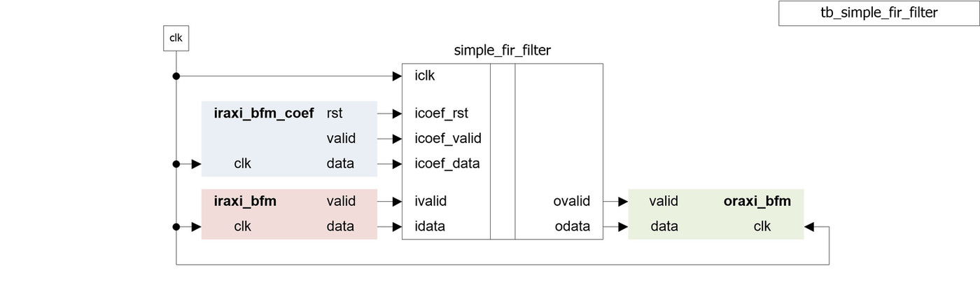 Верхним уровнем тестового окружения в данном примере является файл tb_simple_fir_filter.sv: