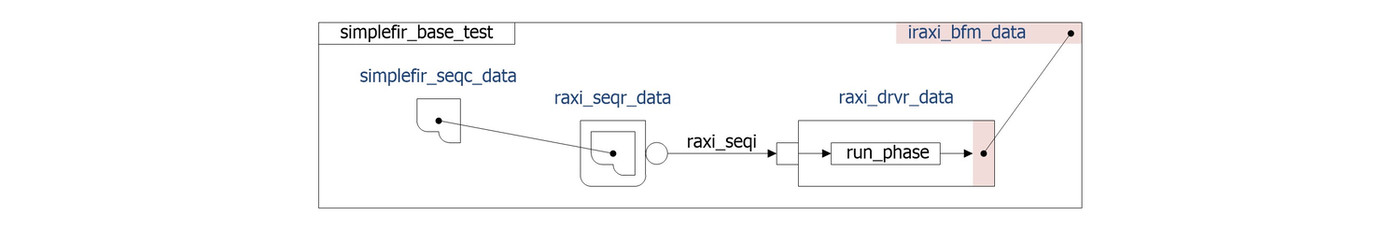 Генератор запускается на секвенсере raxi_seqr_data, который передает формируемые транзакции типа raxi_seqi в драйвер raxi_drvr_data. Драйвер, в свою очередь, транслирует их на интерфейс подачи входного сигнала iraxi_bfm_data.
