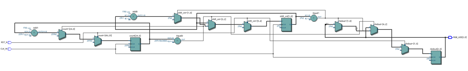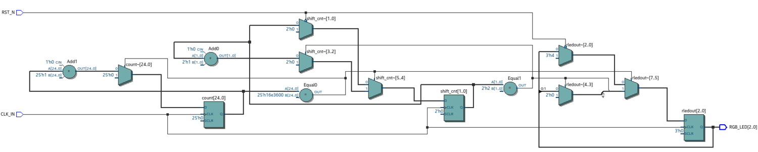 Сравним полученные схемы. В схеме собранной по первому модулю есть только два мультиплексора, которые явно управляются сигналом RST. И это мультиплексор shift_cnt и rledout. Сброс счетчика count происходит не явно.
