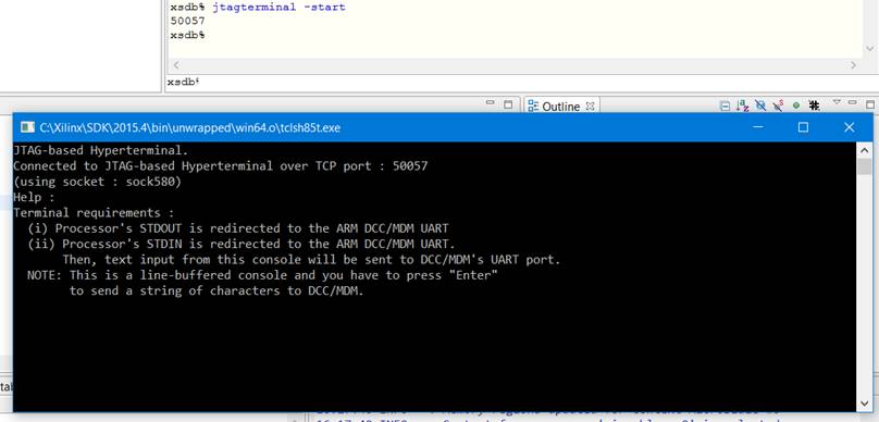 Как видим, текущий таргет 2 – это и есть MDM. Теперь можем запустить терминал, используя команду jtagterminal с опцией –start (рис.9). После выполнения команды откроется новое окно, где будут отображаться результаты выполнения функции xil_printf(), то есть будет дублирование нашей TCF консоли, но в отличие от последней, из этого терминала можно копировать содержимое. Значение 50057 отображает номер порта для терминала и может быть другим.