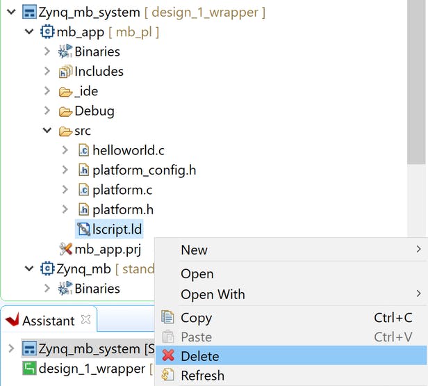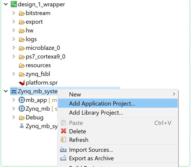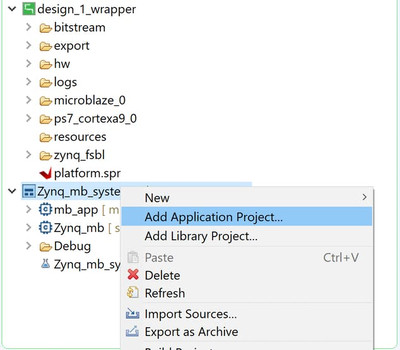 Чтобы создать второе приложение для MicroBlaze, выберите системный проект и щелкните его правой кнопкой мыши, чтобы добавить проект приложения.