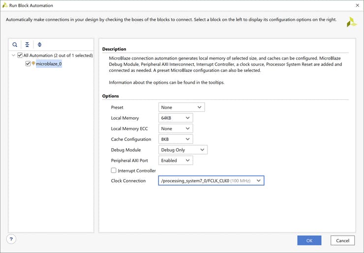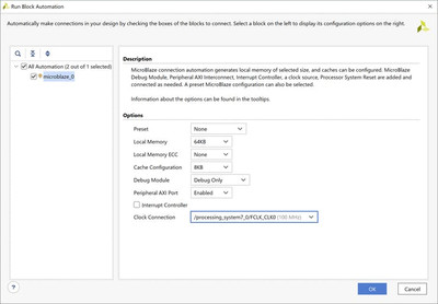 Затем мы можем запустить автоматизацию соединения, которая создаст базовую систему MicroBlaze и подключит ее к Zynq PS.
