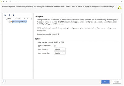 После добавления системы обработки запустите автоматизацию блоков, чтобы сконфигурировать Zynq PS в PL для реализации MicroZed 7020.