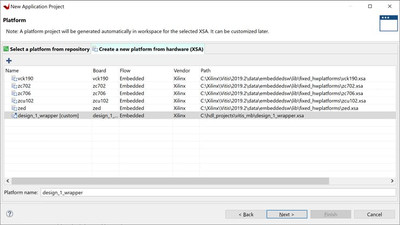 Добавьте платформу: нажмите кнопку «+» и укажите в диалоговом окне экспортируемый XSA (только что созданный с помощью Vivado). Когда будет предложено выбрать процессор для домена, выберите процессор Cortex A9_0.