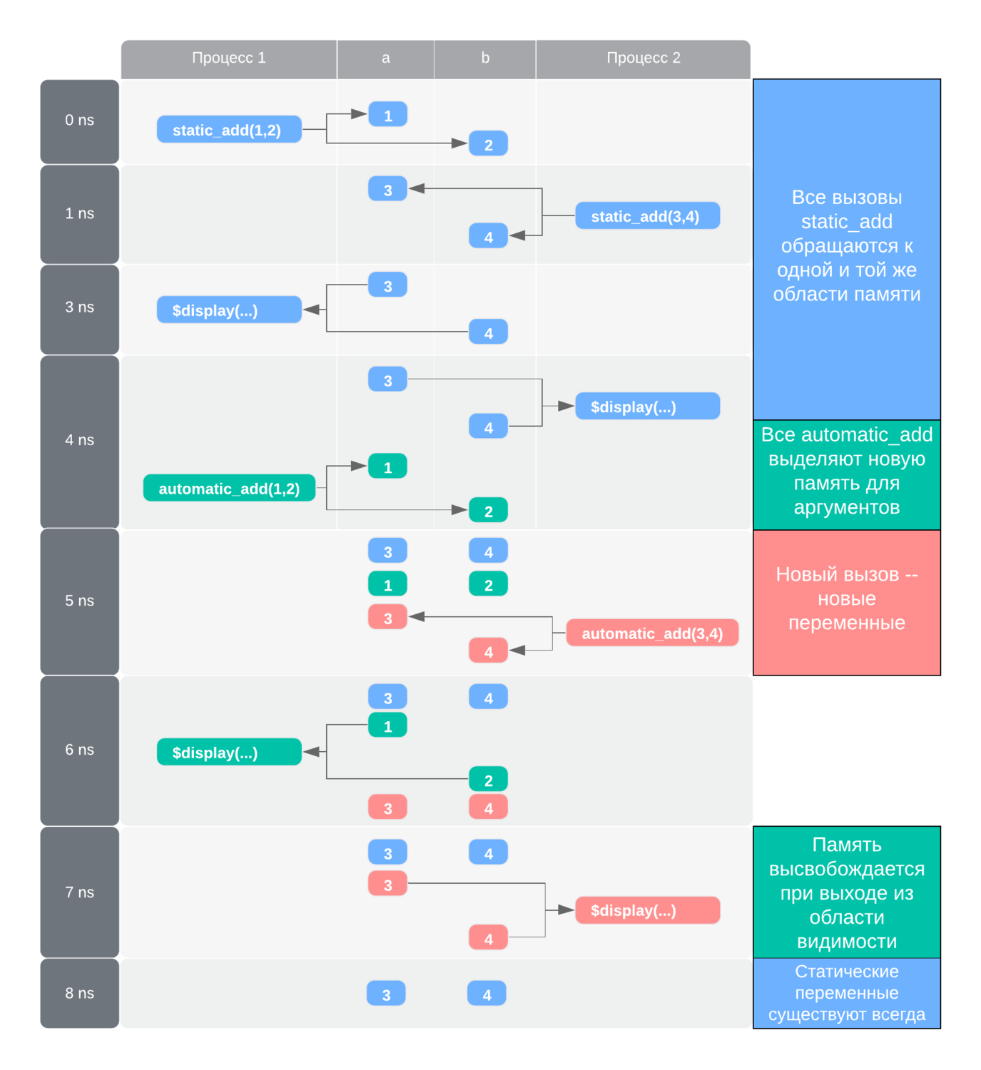 Входные аргументы подпрограммы static_add являются статическими, то есть всегда ссылаются на одну и ту же область памяти. Первый вызов произошёл в 0 нс, аргументы стали равны 1 и 2. В 1 нс в те же области памяти было записано 3 и 4. Так как обращение к переменным подпрограммы совершается только с задержкой 2 нс, то оба вызова увидят одинаковое значение переменных a и b.