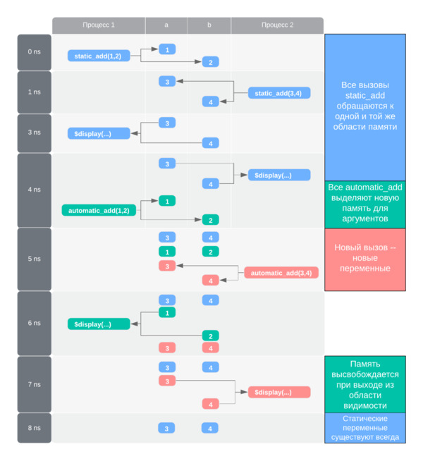 Отметим ещё одну деталь из данного примера. Несмотря на то, что переменные модуля по умолчанию статические, из-за инициализации мы не сможем просто опустить automatic. Стандарт требует явного указания времени жизни переменной в статической подпрограмме или блоке, если она имеет инициализацию в своём объявлении. Таким образом пользователь указывает, хочет ли он инициализировать переменную на каждой итерации (automatic), или только один раз (static). Однако в данном случае использовать static не получится, так как стандарт запрещает инициализацию статической переменной значением автоматической. Это вполне понятное ограничение: статические переменные инициализируются в момент запуска симуляции, а в это время память для автоматических ещё не выделена. Ни один из проверенных симуляторов не скомпилировал ни вариант со static, ни вариант без модификатора.