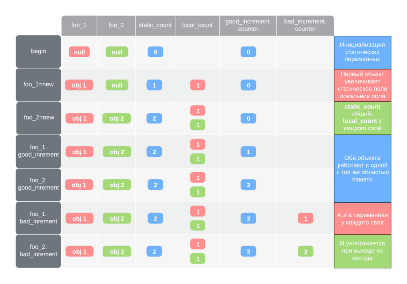 Во-первых, хорошо видно, что статическая переменная класса static_count является общей для всех экземпляров. Во-вторых, обратиться к ней мы можем как через экземпляр, так и через имя класса. В-третьих, повторные вызовы не-статического метода good_increment увеличивают значение одной и той же переменной, как и ожидалось.