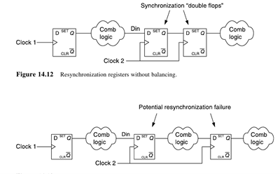 Практически ни один проект не обходится одной частотой тактового сигнала. Классический переход бита из одного тактового домена в другой (clock domain crossing, CDC) реализуется установкой двух и более дополнительных триггеров на стыке доменов для синхронизации.