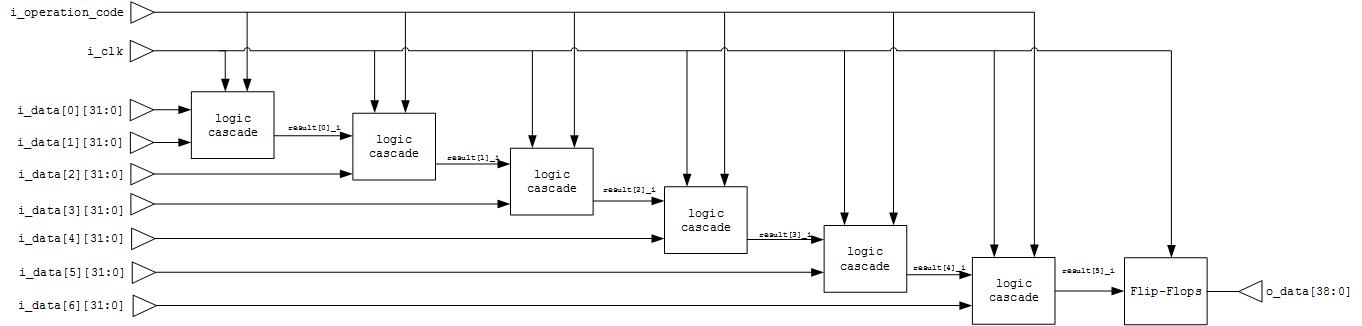 Схема на рис.9 выполняет простую задачу: принимает на вход несколько 32-разрядных чисел и в зависимости от значения бита управляющего входа производит либо их суммирование, либо вычитание. На рис. 10 представлен один каскад схемы (обозначен как Logic cascade на рис.9), который включает в себя входные регистры, сумматор, вычитатель и мультиплексор. Каскад повторяется несколько раз в зависимости от количества входных данных, в данном случае шесть раз. За каскадами идёт цепочка последовательно включённых D-триггеров (Flip-Flops на рис.9), в данном случае четыре штуки. Синтезируемый код, а также полную версию логической схемы можно найти в репозитории, ссылка на который приведена в конце статьи.