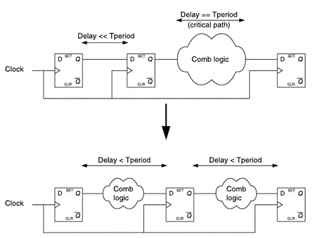 Переместив один из триггеров, мы получим ту же самую схему с той же самой задержкой на прохождение сигнала, однако максимальная частота её работы будет выше, так-как часть комбинаторной логики переместилось между двумя первыми триггерами, что позволило уменьшить Tperiod.
