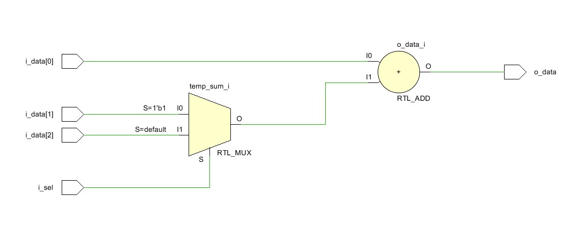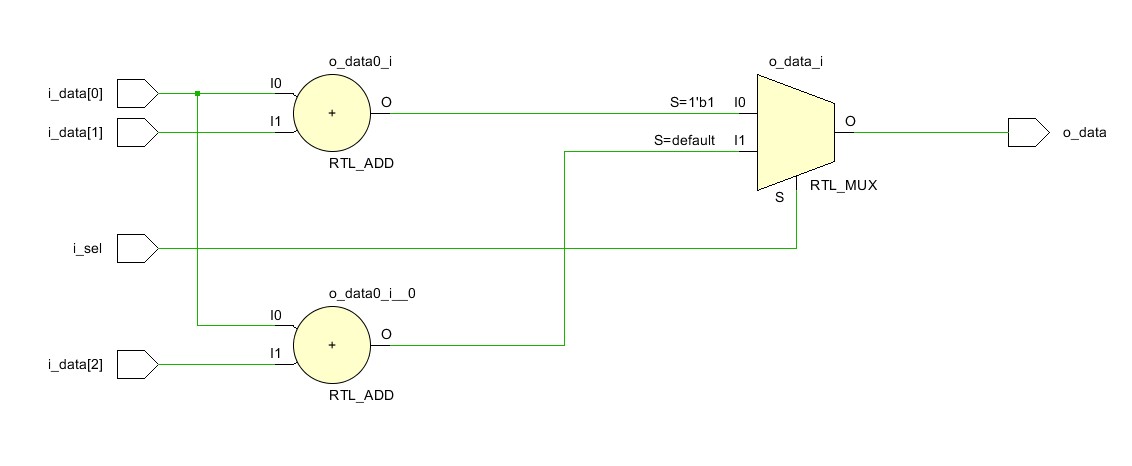 Обе суммы i_data[0] + i_data[1] и i_data[0] + i_data[2] вычисляются независимо друг от друга, что возможно не является самым лучшим решением. Схему можно модифицировать, если заметить, что в обоих суммах первым слагаемым является i_data[0], а второе зависит от входа i_sel. Таким образом, вычисление сумм i_data[0] + i_data[1] и i_data[0] + i_data[2] являются взаимоисключающими функциональными блоками, а значит нам может пригодиться Resource Sharing. Перепишем сумматор с использованием всего вышеописанного: