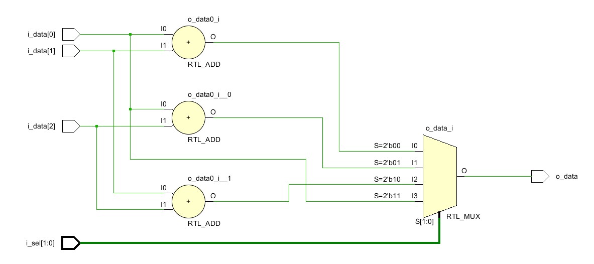 Взглянув на код, можно заметить, что первым слагаемым всегда является i_data[0] или i_data[1], а второе слагаемое i_data[1], i_data[2], либо ноль. Посмотрим, как у нас получится сэкономить ресурсы переписав код с использованием Resource Sharing: