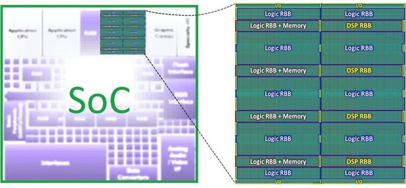 Технология eFPGA очень универсальна, поскольку она может быть встроена как в виде маленького ядра (инстанса или экземпляра), так и в варианте большого исполнения в зависимости от конечного приложения. eFPGA, которая работает как готовый чип FPGA, может быть встроена в разрабатываемую микросхему в течение нескольких дней.