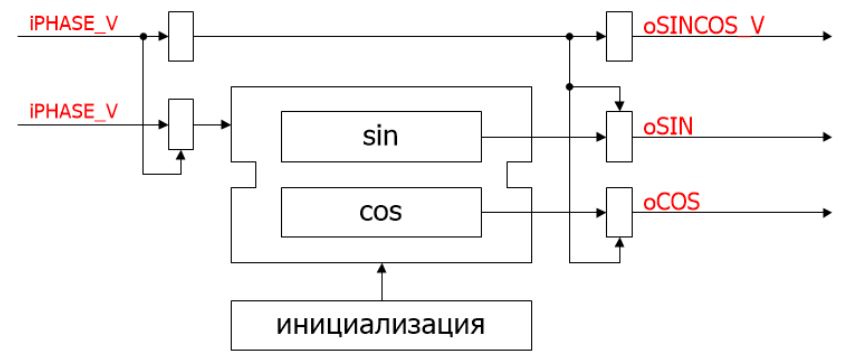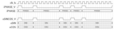 Выходы синуса oSIN и косинуса oCOS представляют собой 16-битные знаковые числа в диапазоне [−32768...32767] и сопровождаются значимостью oSINCOS _ V.