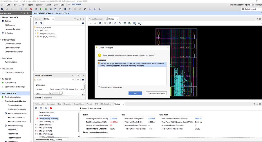Теперь, выполнив начальную оптимизацию (opt_design в окне TCL) и получив отчет QoRA, мы можем внести любые необходимые изменения, необходимые для констрейнов, настроек имплементации, выбора целевого кристалла и speed grade. При необходимости возможно внести любые необходимые изменения в модулях RTL и HLS в рамках проекта.