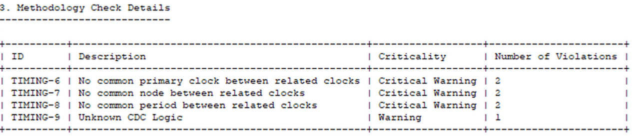 Наконец, проверка методологии покажет, какая методология проектирования не соблюдается должным образом. В этом случае мы видим, что у нас нет констрейнов, которые определяют связь между clock’ами в дизайне.