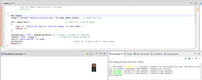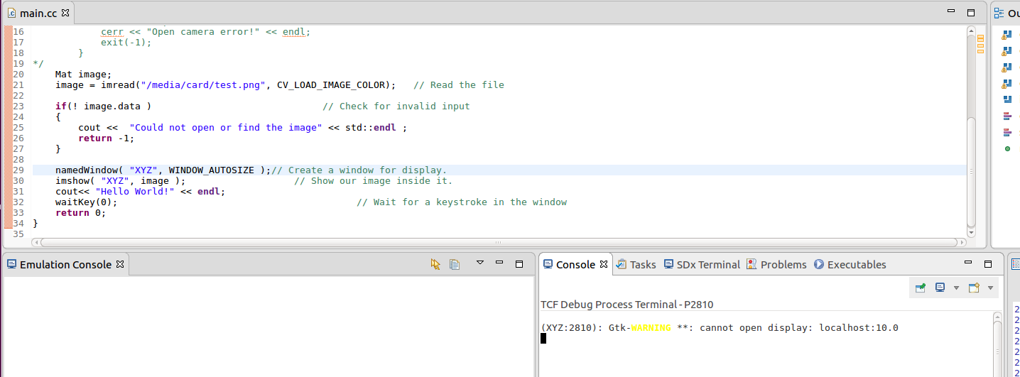 Так вот, когда мы вызываем дебаг и бежим по программе доходим до команды imshow консоль SDK выдает ошибку "cannot open display" и выполнение стопорится на этом шаге.