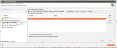 После того как мы зашли на плату, командой echo $DISPLAY проверим какой сейчас задан параметр этой переменной окружения. Дальше идем в настройки дебагера и открываем вкладку Environment: