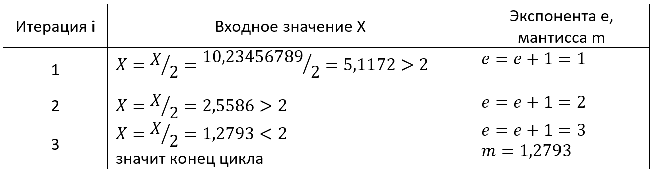 - Если больше 1, то Х итерационно делится на 2 до тех пор, пока не станет меньше 2. Число итераций непосредственно определяет экспоненту e. Если меньше 1, то Х итерационно умножается на 2 до тех пор, пока не станет больше 1. Число итераций определяет экспоненту e с инверсией знака.