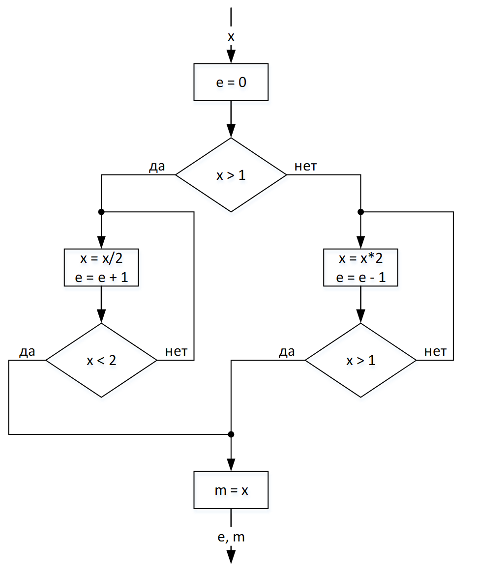 Вычисление экспоненты e и мантиссы m можно представить блок-схемой на рисунке 2. Процесс вычисления e и m выполняется следующим образом: