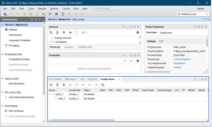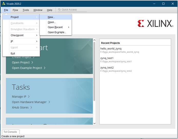 Создаем новый проект и попробуем повторить функционал, который выведет строчку "Hello world" чере UART порт (для того, чтобы это увидеть, нам потребуется переходник USB UART). В таком проекте потребуется настроить по-минимуму аппаратную часть ZYNQ: порт UART, DDR память; и написать прошивку для ядра.