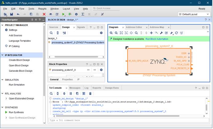 В IP INTEGRATOR создаем блок Create Block Design имя оставлю по умолчанию