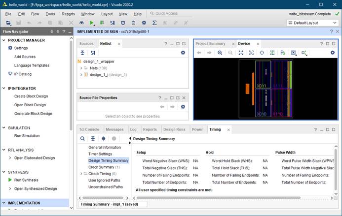 Далее запускаем Run Synthesis, Run Implementation, Generate Bitstream. В итоге можно открыть Implementation Design и посмотреть на него (как на новые ворота)