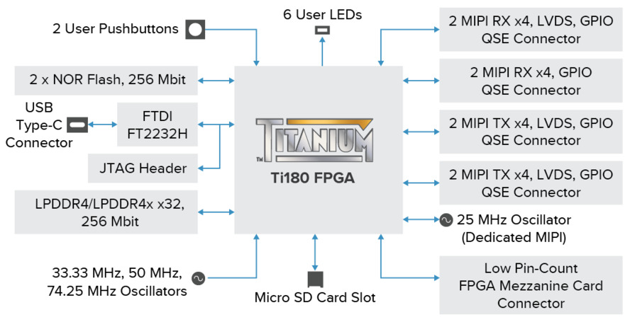 - Efinix Ti180M484I3 FPGA in a 484-ball FineLine BGA package