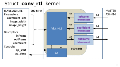 Пример основан на учебном проекте Xilinx и показывает как можно произвести свёртку видео на ускорителе Alveo. В исходном примере Xilinx показано как разработать кернел на Vitis-HLS. В преобразованном примере HLS кернел помещается внутрь RTL кернела и это позволяет поднять тактовую частоту работы с 300 МГц до 500 МГц.