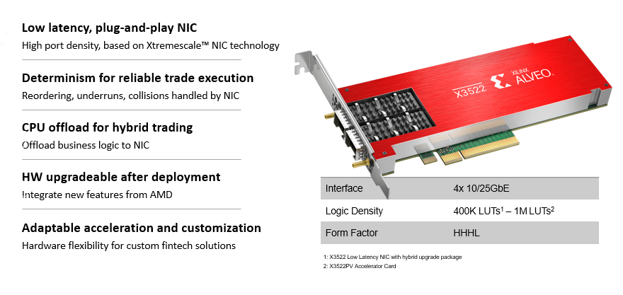 Сегодняшние ведущие маркет-мейкеры, хедж-фонды и биржи требуют исполнения сделок с низкой задержкой и управления рисками для получения конкурентных преимуществ. Новая серия Alveo™ X3 — это первые сетевые карты AMD, разработанные с использованием screened FPGA (напишите в комментах что за screened FPGA) и оптимизированные специально для торговли с низкой задержкой. В настоящее время карты в производстве и отгружаются.
