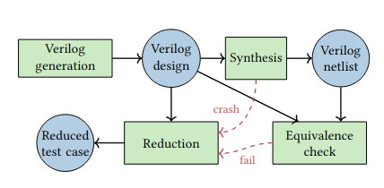 Любопытная статья 2020 года о поиске багов в синтезаторах логики с помощью инструмента с открытым кодом. Инструмент, разработанный авторами (Yann Herklotz, John Wickerson), генерирует случайный модуль на Verilog. Результат синтеза случайного модуля сверяется с исходным RTL. Авторы использовали свою разработку, чтобы проверить такие инструменты, как Yosys, Vivado, XST и Quartus Prime. В результате во всех инструментах, кроме Quartus Prime, авторы обнаружили несоответствия нетлистов и исходного кода для ряда случаев. Со статьёй можно ознакомиться по ссылке (язык - английский): https://yannherklotz.com/papers/fubfst_fpga2020.pdf