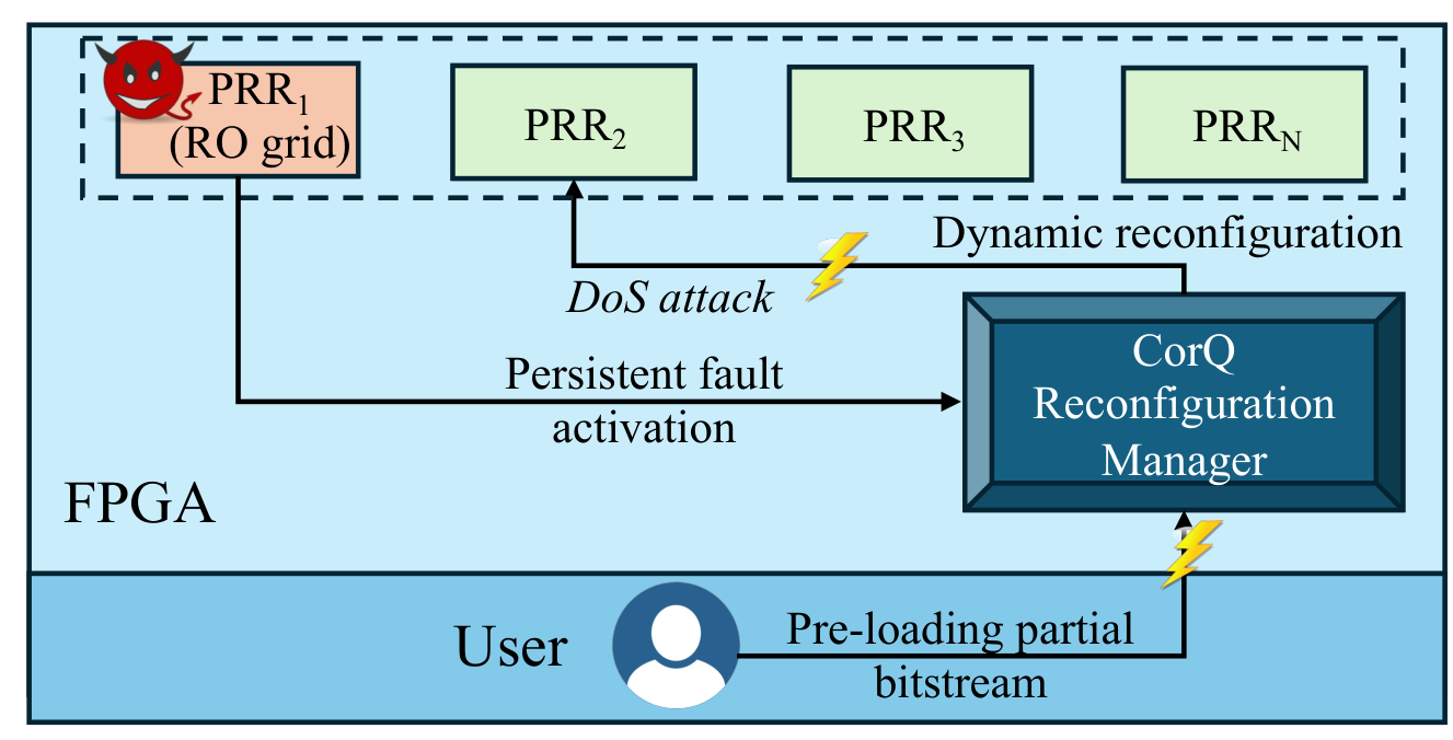 Атака использует цепи, которые вызывают колебания напряжения во время загрузки частичных битстримов, что может привести к сбоям в вычислениях или отказу в обслуживании (DoS) для других пользователей, совместно использующих ПЛИС. В отличие от предыдущих атак с внедрением ошибок, которые требуют непрерывного воздействия, этот метод должен быть активен только краткое время во время передачи битстрима, что затрудняет его обнаружение. Авторы демонстрируют эффективность своей атаки путём экспериментов над различными прикладными битовыми потоками, включая ускорители нейронных сетей и обработки сигналов, показывая, как эти устойчивые ошибки могут нарушить целостность вычислений.