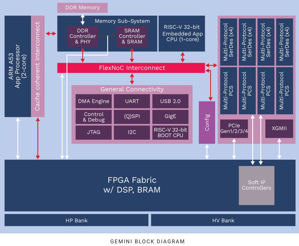 Дебютные программируемые логические устройства Rapid Silicon под кодовым названием Gemini разработаны с особым акцентом на интеграцию с ПЛИС, высокопроизводительные приемопередатчики, возможности управления и применения с процессорами RISC-V и ARM, а также подключение plug-and-play с использованием аппаратного интерконнекта FlexNoc. Богатый набор функций, оптимизированный по энергопотреблению для удовлетворения потребностей в обработке информации с массива датчиков, жесткие тепловые профили и малый форм-фактор - определяюют Gemini для работы в встраиваемых и краевых приложениях.